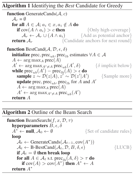알고리즘 1은 이 접근의 개요를 보여주는데 KL-LUCB에 의해 선택된 규칙이 anchor인지 평가할 때 이것이 우리의 정밀도 평가를 만족하는 지 확신이 들어야 함