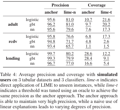 LIME과 anchor는 validation set을 통해서 구조화되고 test set에 대해서 precision(얼마나 설명되는가)과 coverage(예측 중 얼마나 맞았는가)를 평가함