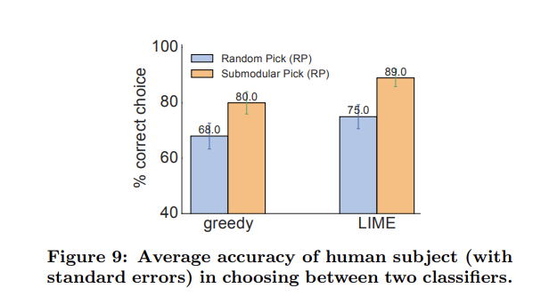- 실험적 검증: 비전문가도 LIME 사용하여 더 일반화가 잘 되는 모델 고를 수 있었음 / feature engineering 통해 신뢰할 수 없던 classifier를 개선할 수 있음 / 이미지 분류용 neural network이 예측을 분석해서 언제, 왜 모델을 믿으면 안 되는지도 알 수 있음