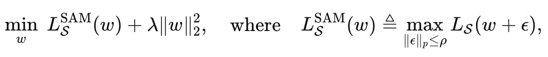 따라서 본 연구는 손실값 Ls를 낮게 하는 파라미터 w를 찾는게 아닌 해당 파라미터 w 근처의 이웃(neighboring) 파라미터에서 손실값이 균일하게 낮은 지역을 탐색한다.