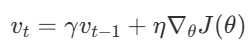 Momentum은 이전 단계의 업데이트 벡터(Velocity)를 기억하고, 그 중 일부(γ)를 현재 업데이트에 더한다.