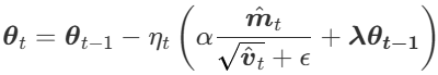 - Adam에 L2 정규화를 적용하면 정규화 항도 적응형 학습률 계수(1/√v_t)로 스케일링되어,