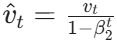 이 과정을 통해 학습 초기 단계에서도 적절한 크기의 스텝 사이즈를 확보할 수 있으며, 학습이 진행됨에 따라 보정 항(1- β^t)은 1에 수렴하여 영향력이 줄어든다. ( 이면 이므로 분모→1)