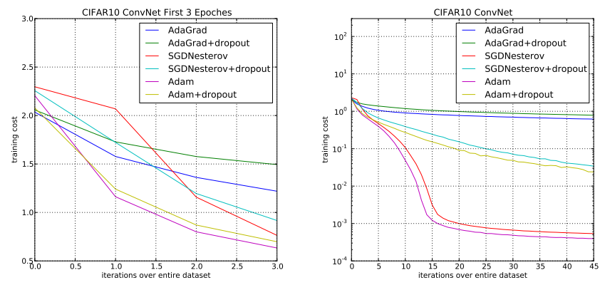 IMDB 데이터셋을 이용한 로지스틱 회귀 실험에서, Adam은 희소한 피처를 다루는 데 강점이 있는 AdaGrad와 동등하거나 더 빠른 수렴 속도를 보였다. - 드롭아웃(Dropout)과의 호환성
