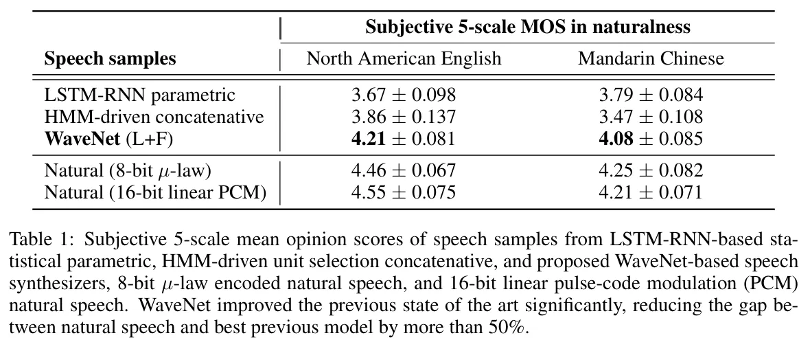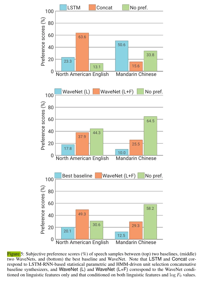 - WaveNet (L+F) vs 최고 baseline: 49.3% vs 20.1% (30.6% 선호 없음)