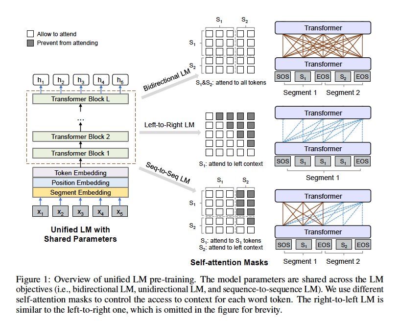 - UniLM이 여러 가지 LM을 사용하여 서로 다른 LM의 목적을 위해 서로 다른 segment embedding을 사용하기 때문에, segment embedding은 LM 식별기의 역할도 함