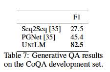 - UniLM이 다른 모델들에 비해 월등히 뛰어난 결과를 보이는 것을 확인할 수 있음