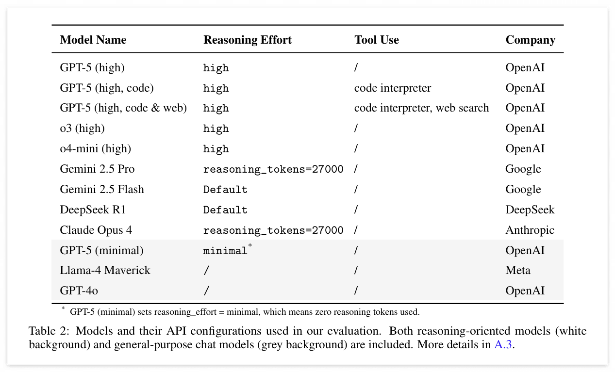 Figure 3의 Main plot에서 확인할 수 있듯,모든 모델이 매우 낮은 점수를 기록했다. 외부 도구를 사용하지 않는 기본 모델 중에서는 GPT-5(high)가 5.7%로 가장 높은 성능을 보였으며, 다른 모델들은 모두 0~2% 수준에 머물렀다.