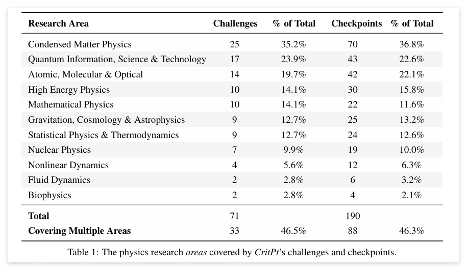 위 표는CritPt에서 다루는 물리학 연구 분야에 관한 통계를 담고 있다. 응집물질물리학, 양자정보 과학 및 기술, 원자·분자·광학 물리학, 고에너지 물리학, 수리물리학 등현대 물리학 전반을 폭넓게 다루고 있음을 확인할 수 있다.표의 아랫부분의 'Covering Multiple Areas'는두 개 또는 그 이상의 물리학 분야를 동시에 아우르는 문제라는 의미로, 물리학 분야에서의 다학제적 연구 흐름의 확대가 반영되어 절반에 가까운 문제가 Multiple Areas를 다루고 있음을 알 수 있다.