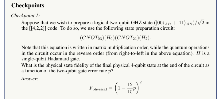 문제는 점진적으로 난이도가 높아지는 세 개의 checkpoints로 분해된다. 첫 번째 checkpoint에서는 오류 정정을 적용하지 않은 상태에서 기본적인 손상 정도를 계산한다. 두 번째 checkpoint에서는 오류 탐지 코드를 적용했을 때 손상이 얼마나 줄어드는지를 분석한다. 여기서는 물리적 오류와 논리적 오류를 비교하게 되며, 오류 탐지 코드가 제대로 작동한다면 논리적 오류가 더 작아야 한다. 마지막 checkpoint에서는 한층 복잡한 상황을 다룬다. 상태 준비 과정이 더 정교해지고, 오류가 회로를 통해 전파되는 방식까지 고려해야 하며, 단순 계산이 아니라 시뮬레이션과 알고리즘 구현이 필요해진다.