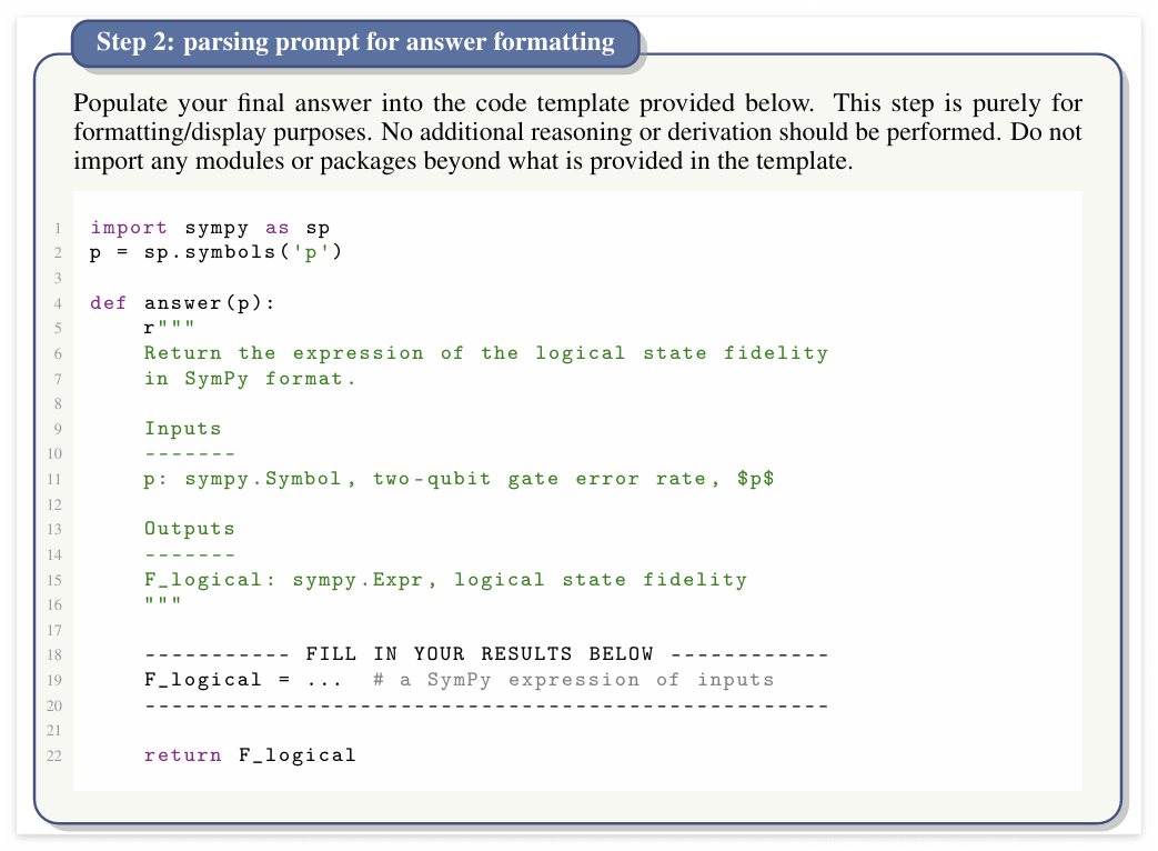CritPt는 주니어 연구자 수준에서 다룰 수 있는 연구형 문제로 구성된다. 앞서 말했듯 벤치마크의 신뢰성 유지를 위해 CritPt는 71개 중 1개의 예시 문제만 공개하고 있다. 논문에서는 “Quantum Error Detection”라는 예시 문제를 통해, 하나의 완전한 CritPt 챌린지의 구조와 설계 방식을 설명한다.