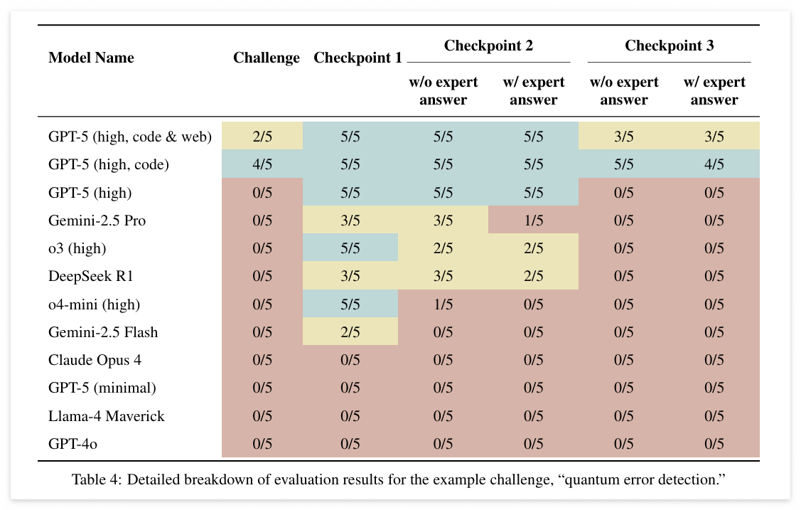 이 기준을 적용하면 앞선 실험들 대비 모든모델에서 성능이 급격히 하락하는데, 이는복잡한 물리학 연구 맥락에서 모델 행동의 확률적 변동성(stochastic)이 매우 높다는 점을 시사한다.