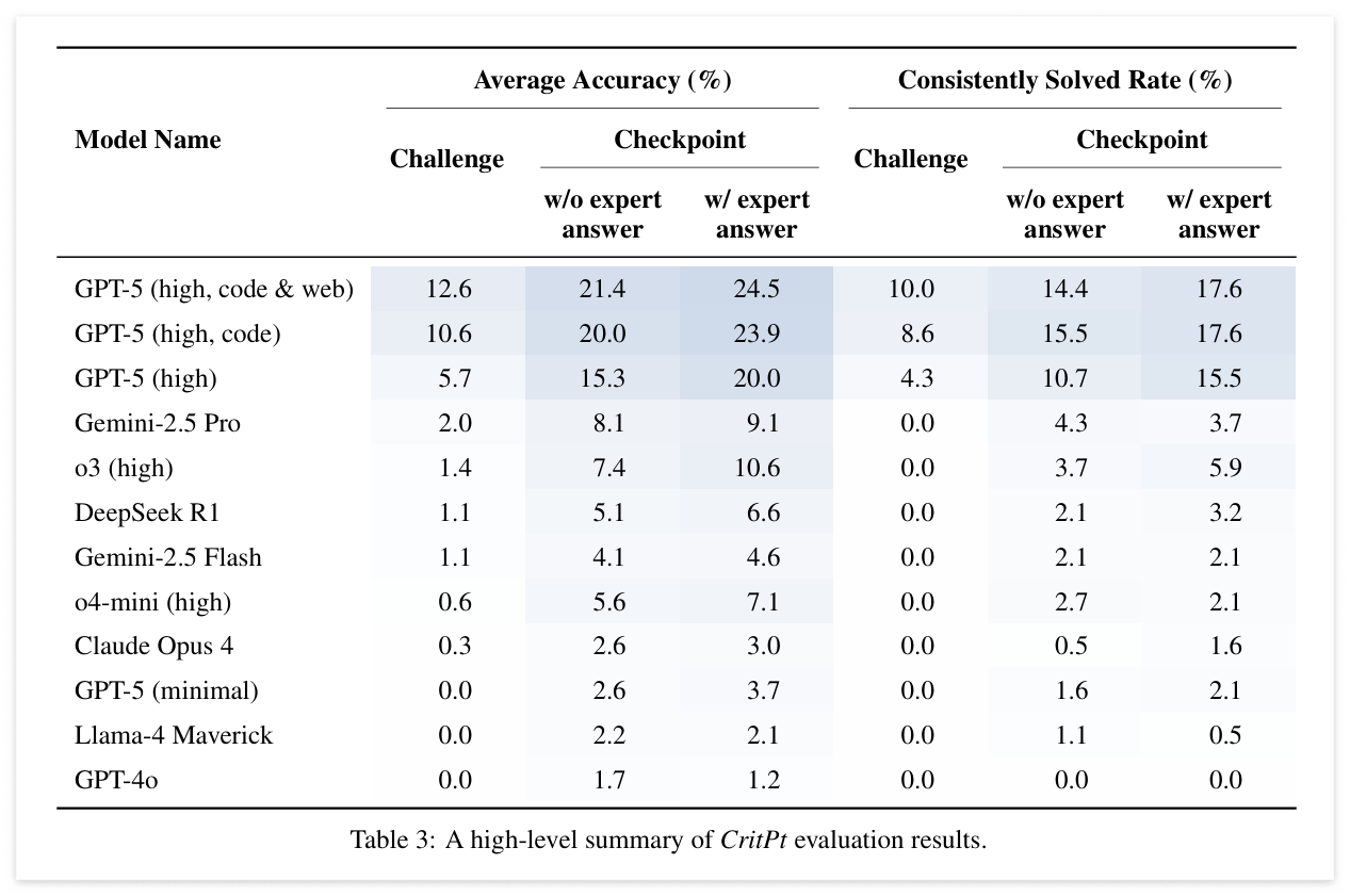 Table 3은CritPt에 대한 평가 결과를 종합적으로 요약한 표이다. 결과에 대한 구체적인 분석은 이어지는 글에서 다루었다.
