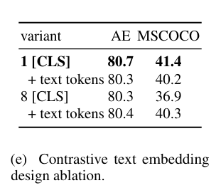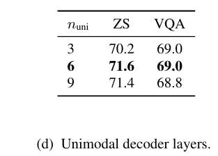 Decoder을 분리한 모델 설계가 unimodal 의 층 부족으로 zero-shot에서 낮은 성능을 보일 것이라는 우려와 다르게 성능 저하가 일어나지 않았습니다. 이를 통해 unimodal과 multimodal layer을 반반(n_uni=6)으로 나누는 것이 최적의 균형임을 알 수 있습니다. 또한 특징을 병합하기 위해 학습 가능한 CLS토큰을 토큰 텐서 단독 일 때와 원본 입력 문장의 모든 단어 텐서들을 concatenation하여 사용할 때를 비교한 결과 원본 입력 문장 단어 텐서들을 배제하고 단독으로 추출하여 constrative 학습에 사용하는 것이 가장 높은 벤치마크를 기록하였습니다. 이는 contrastive loss는 CLS 토큰 파라미터를 강하게 업데이트하도록 하고 captioning loss는 나머지 단어 토큰을 업데이트하게 한다는 것을 알 수 있습니다.