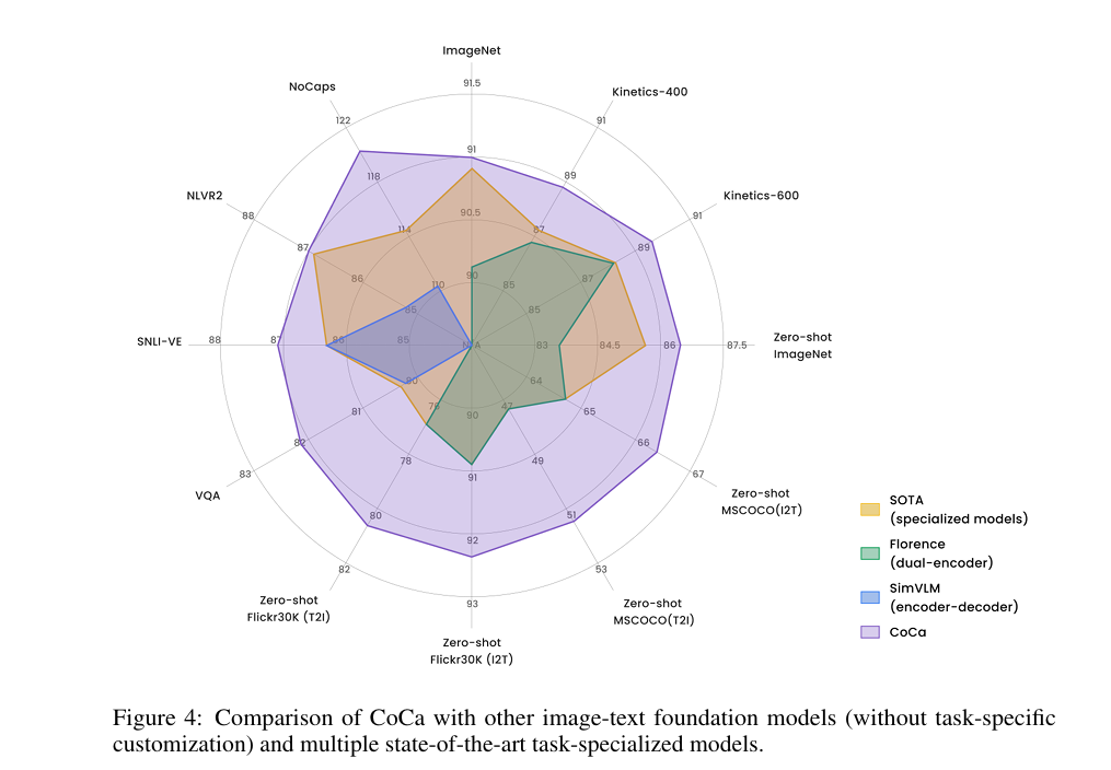 위의 그림은 현재 SOTA의 encoder-decoder, dual-encoder 기반 모델들과 CoCa의 핵심적인 benchmark를 비교하여 요약한 그래프 입니다.