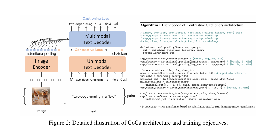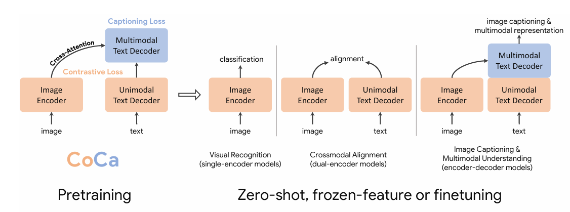 Multimodal understanding의 경우 CoCa는 image와 text를 joint하게 encode하기 때문에 두 형태 모두에서 추론이 가능합니다.