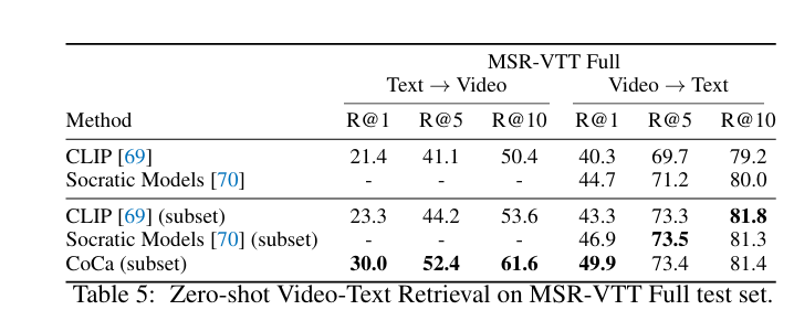 Image와 text 사이의 retrieval를 평가하기 위해 Flicker 30K, MSCOCO를 Image 분류를 평가하기 위해 ImageNet을 video와 text 사이의 retrieval을 평가하기 위해 MSR-VTT를 benchmark로 선정하였습니다. 이때 MSR-VTT의 경우 유튜브를 이용하였기에 데이터를 찾을 수 없는 경우가 있어 현재 사용가능한 데이터만으로 평가한 지표들에 대해 (subset)의 태그를 표기하였습니다.