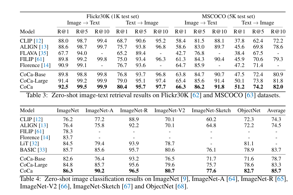 또한 CoCa는 pretrain 이후 parameter 들이 frozen 되어 임베딩을 추출하는 데 직접 사용되기 때문에 zero-shot을 중점적으로 실험을 진행합니다.