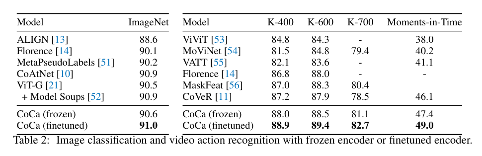 연구팀은 비디오 액션 인식 작업을 CoCa 모델로 가능하게 하기 위해 비디오의 여러 프레임을 공유 imager encoder에 공급하였습니다. Frozen feature 평가와 finetuning을 위해 연구팀은 공간과 시간적 feature 토큰 위에 softmax cross-entropy loss를 가진 pooler을 학습시켰습니다.