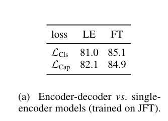 JFT-3B 데이터들을 사용하여 ViT-Base 단일 encoder 모델을 captioning loss로 학습된 encoder-decoder 모델과 visual 특징 추출 성능일 비교한 결과 대등한 성능을 달성하였고 이는 captioning 학습이 classification 능력을 포함한다는 것을 알 수 있습니다.