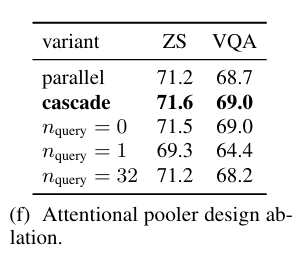 Contrastive loss 각 이미지에 단일 임베딩을 사용하는 반면 decoder은 일반적으로 이미지 시퀀스를 처리합니다. Singel pooled된 image 임베딩은 글로벌적인 시각적 인식에 도움이 되는 방면 많은 visual 토큰들은 지역적인 수준의 특징이 필요한 multimodal 이해에 도움이 됩니다. pooler은 n_query개의 학습 가능한 query가 있는 단일 multi-head attention 층이며 출력은 key와 value이다. 이를 통해 서로 다른 길이의 임베딩을 pooling할 수 있어 언급된 두 목적 함수 모두 학습할 수 있습니다.