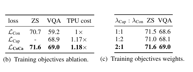 CoCa는 contrastive 모델에 비해 zero-shot에서 우수한 성능을 보였고, generative 모델과 VQA에서 비슷한 성능을 유지하였으므로 두가지 목적을 모두 달성하였음을 알 수 있습니다. 또한 captioning loss의 비율이 증가함에 따라 VQA의 성능이 향상되는 것을 관측할 수 있었습니다. 하지만 VQA 성능을 비교하였을 때 CoCa가 단일 generative loss만 이용하였을 때보다 우수한 성능을 얻었다는 것을 알 수 있었습니다.