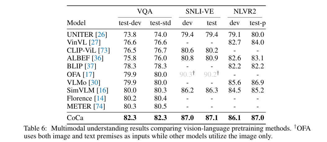 visual 질의응답을 위해 VQAv2, visual 함의를 위해 SNLI-VE, 그리고 시각적 추론을 위해 NLVR2를 benchmark로 이용하였고 결과는 다음과 같습니다.