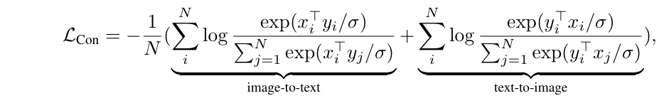 위 식에서 x_i와 y_i는 각각 i번째 image 데이터에 대한 임베딩과 그에 대한 text 데이터의 임베딩입니다. N은 batch 크기 σ는 logit의 범위를 조절하는 temperature입니다.