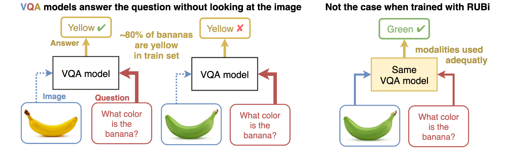 기존 model에서는 두 modality의 정보를 병합하도록 설계되었지만, 실제로는 답변 발생과 문제의 특정 패턴 사이의 statistical regularity를 이용하는 경향 때문에 이미지 양식을 고려하지 않고 대답하는 경우가 많았다. 이미지를 보고 바나나를 감지하고 바나나의 색을 평가하는 대신, 가장 많이 발생하는 답변인 노란색으로 '무엇, 색깔, 바나나'를 연결하는 통계적 바로 가기를 통해 학습하는 것이 훨씬 더 쉽고, 다른 통계적 규칙성을 나타내는 테스트 세트에서 평가할 경우 일반적으로 정확도가 크게 떨어진다. 때문에 대부분의 바나나가 노란색인 경우, 모델은 바나나의 색을 묻는 질문에 대해 높은 정확도를 달성하기 위해 올바른 동작을 학습할 필요가 없다. 하지만 여러 데이터에 대해서, 위의 그림처럼 더 나은 행동을 학습하기 위해서는 질문 양식에서 오는 편향을 줄이기 위한 새로운 전략이 필요하다.