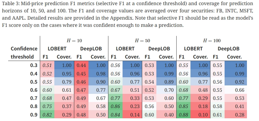 LoBERT는 다양한 기간과 신뢰도 임계값에서 DeepLOB보다 일관되게 우수하거나 동등한 성능을 보인다. 특히 신뢰도 필터링에 민감하게 반응한다: $\tau_c$가 0.3에서 0.9로 증가함에 따라 매크로 F1 값이 현저하게 향상되는 반면($H=100: 0.55 \to 0.88$), 커버리지는 감소($1.00 \to 0.1$). 이는 쉬운 사례와 어려운 사례를 효과적으로 구분하고 있음을 나타낸다.
