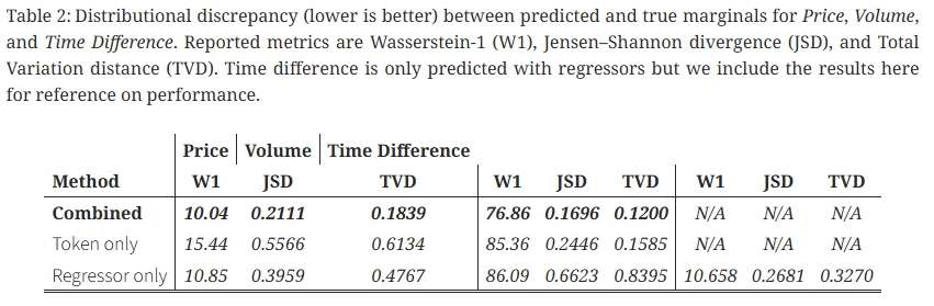 세 가지 변수와 세 가지 측정 기준 모두에서, Combined 모드가 두 가지 제거 방식에 비해 일관적으로 가장 작은 차이를 보인다. 토큰 헤드는 확률이 높은 구조적 모티프(측면/유형 및 대략적인 가격-거래량 분위수)를 포착하는 반면, 회귀 변수는 연속 잔차와 희귀 값을 정제하여 이산화 오류를 줄인다.