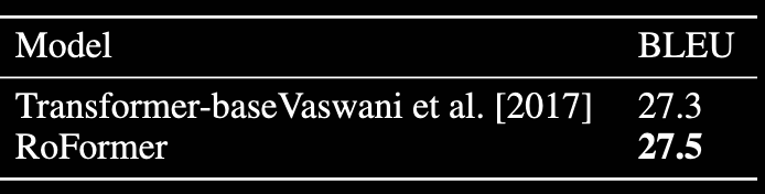 명시적인 상대적 위치 의존성을 포함하는 새로운 위치 임베딩 방식 개발. 절대적 위치 임베딩의 회전 변환을 통해서 self attention에서 상대 위치 정보를 인코딩할 수 있다는 사실을 밝혀냄. 영어와 중국어 데이터에서 RoPE를 사용한 결과 더 빠른 수렴과 몇몇 task에서 더 나은 성능을 보임. 또한, RoFormer가 긴 문장을 다루는 문제들에서 더 좋은 성적을 보였음.
