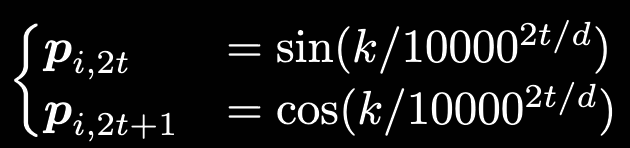 Vaswani는 이 위치 정보 $p_i$를 sinusoidal 함수를 통해 생성했음.