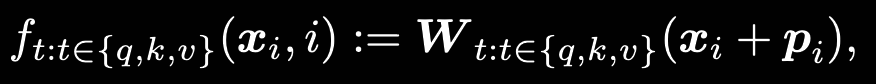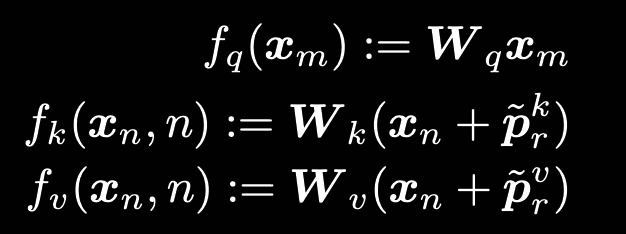 쿼리는 가중치 x 내용 임베딩, 키와 벨류는 가중치 x (내용 임베딩 + 상대적 위치 정보) 형태.