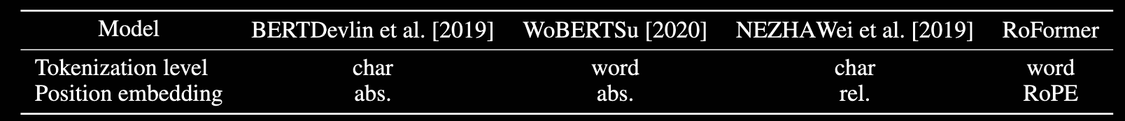 Baseline 모델인 WoBERT에서 absolute position embedding을 RoPE로 대체.