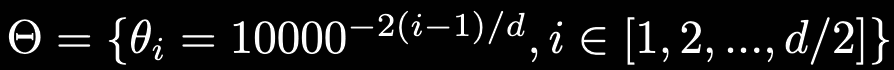 $\theta$는 이미 정의된 변수로, 다음과 같은 값을 가짐. sinusoidal positional encoding과 동일한 주파수 스케줄 사용.