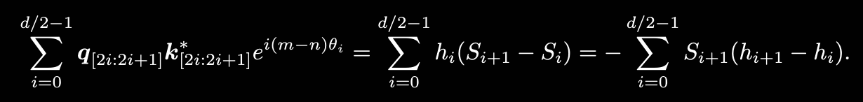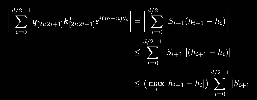 attention score는 사실상 $|S_{i+1}|$로 결정되는데, 상대 거리인 m-n의 값이 커지면 i가 조금만 커져도 벡터의 방향이 급격하게 변하기 때문에 벡터의 합이 점차 작아짐. 따라서 상대 거리가 먼 토큰은 약한 연결을 갖는다고 말할 수 있는 것.