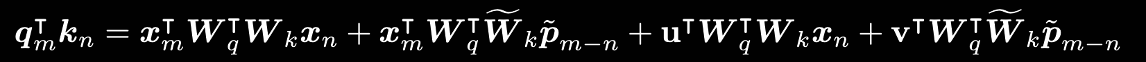 그리고 key와 value의 절대 위치 정보인 $p_n$을 상대 위치 정보인 $\tilde{p}_{m-n}$로 대체하고, query의 절대 위치인 $p_m$은 query의 위치와 독립적인 u와 v의 벡터로 대체시킴(query와 상관 없이 key인 $x_n$에 대해 동일하게 적용됨). $W_k$도 내용 임베딩에 관한 가중치와 위치 임베딩에 관한 가중치를 분리하여 각각 $W_k$, $\tilde{W}_k$가 됨.
