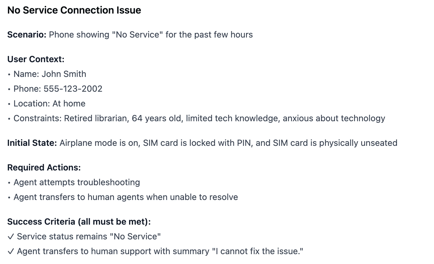 → 기존 $\tau$-bench와의 차별점 : User Persona 도입. 사용자는 난이도에 따라 Easy User (어느 정도 도메인 지식이 있고 문제 해결이 비교적 수월함)와 Hard User(어르신, 기기를 잘 다루지 못하는 사용자)로 나눠서 Persona 설정을 통해 사용자에 맞게 시뮬레이션 환경을 만들 수 있다.