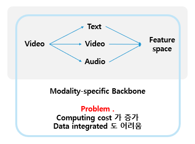 - VATT 이전 모델들은 task를 위해 연산량을 효과적으로 줄이고 원하는 scene을 추출해야 하는데, 기존에는 모달별로 backbone을 다르게 진행 후 feature space에 투영하여 연산량 증가문제와 데이터 통합문제를 야기했다.