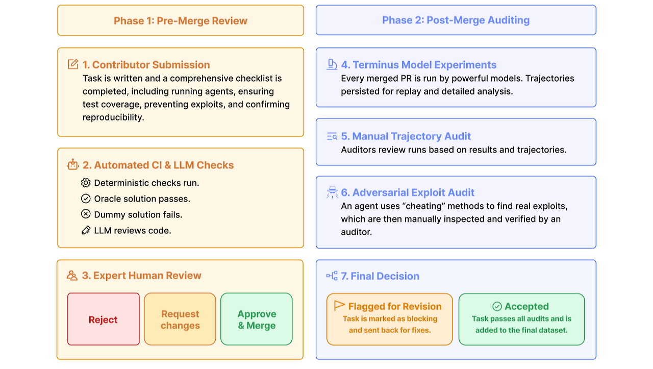 - 검토 프로세스: 기여자들의 체크리스트 작성, LLM을 활용한 자동화된 실수 검토, 자동화된 솔루션 테스트 외에도, 여러 최신 모델을 통해 테스크를 직접 실행해 보거나 적대적 공격 에이전트를 투입해 시스템의 허점을 악용할 수 있는지 검사하는 과정을 거쳤습니다.