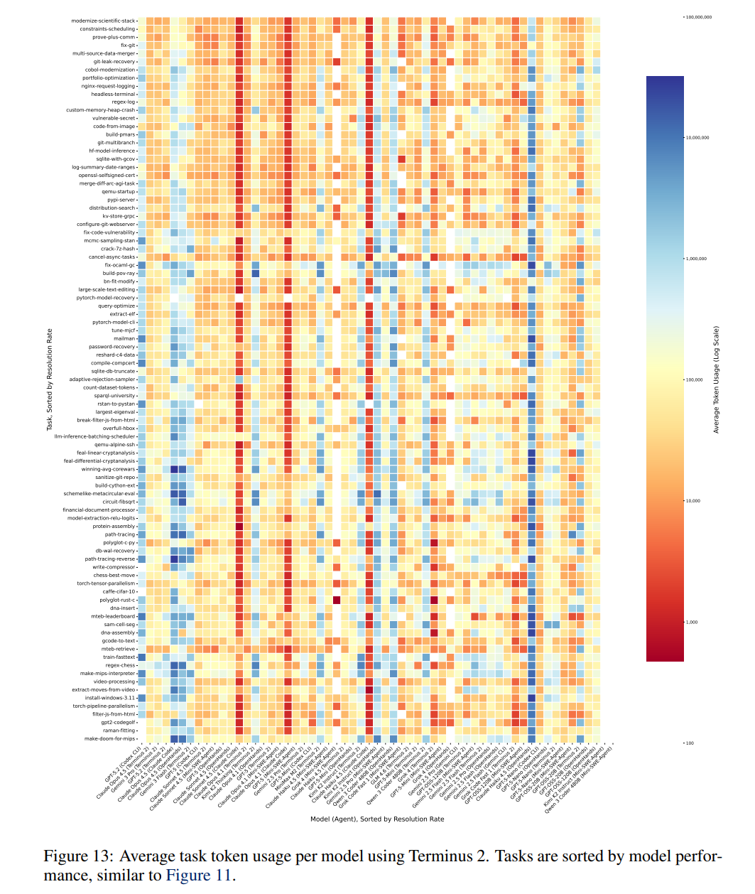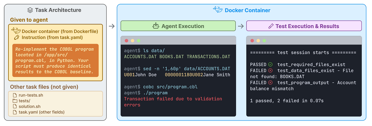 - 상호작용적 탐색: 에이전트는 제공된 Bash 명령어 등 다양한 도구를 사용해 스스로 환경을 탐색하고 조작하며 목표를 달성해야 합니다. 이 과정은 Harbor 프레임워크를 통해 실행되며 Cluade Code, Codex CLI 등 다양한 에이전트를 지원합니다.