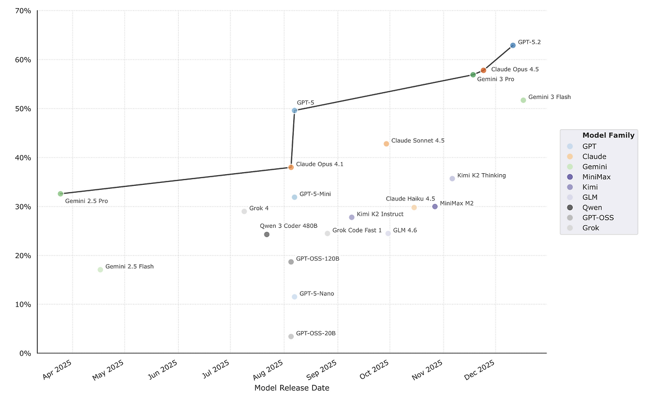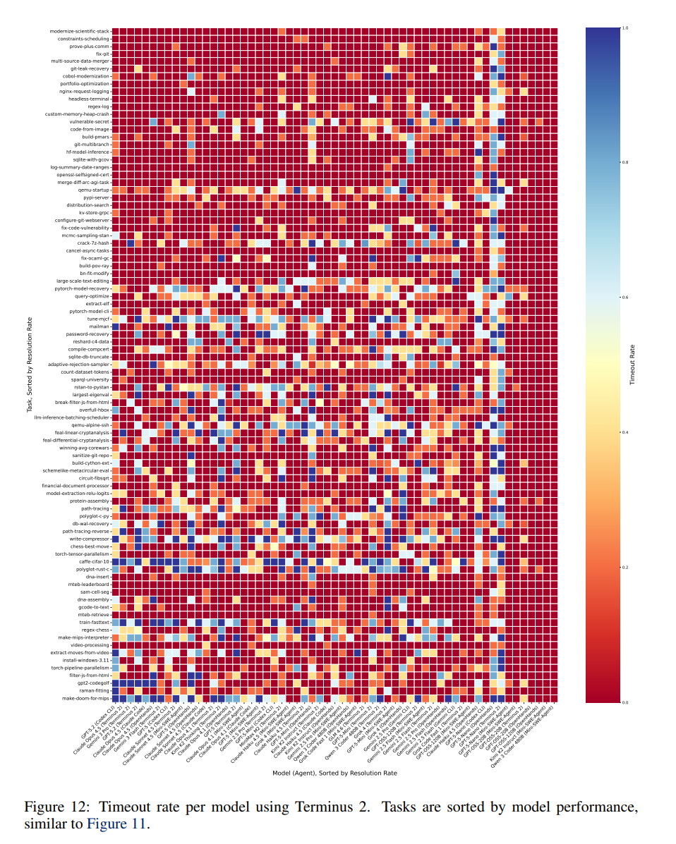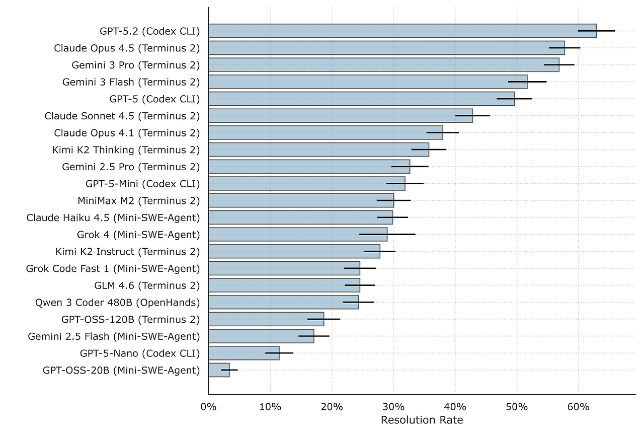 - 성능 순위: 상위권 모델도 65% 미만의 해결률을 보였습니다. GPT-5.2와 Codex CLI 조합(63%)이 1위를 차지했으며, Terminus 2 에이전트 기반의 Claude Opus 4.5(58%), Gemini 3 Pro(57%)가 뒤를 이었습니다. 오픈 소스 모델 중에서는 Kimi K2 Thinking이 36%로 가장 높았습니다.