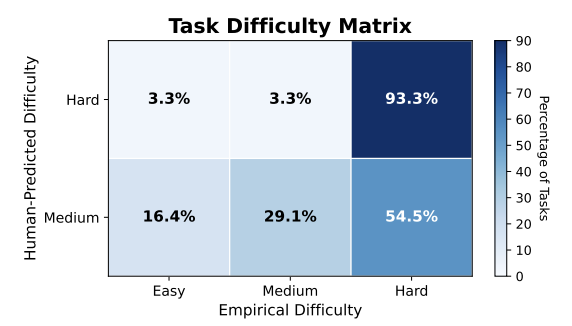 - 잔존 오류 가능성: 테스크당 3시간 이상의 방대한 수작업 검증과 LLM 검토를 거쳤음에도 불구하고, 과제들이 워낙 다양하고 복잡하여 여전히 일부 테스트 스펙이나 지시 사항에 결함이 남아있을 가능성을 배제할 수 없습니다.