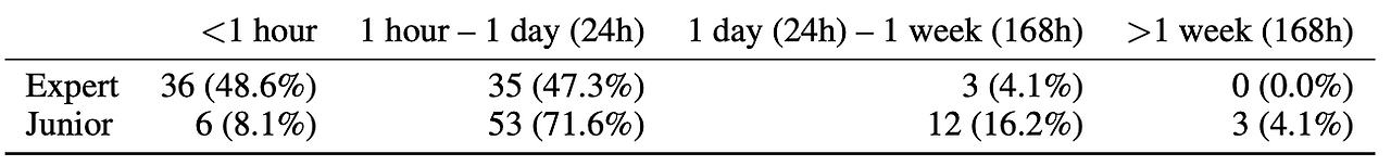 - 소요 시간의 현실성: 전문가의 경우 95% 이상의 테스크를 1일 이내에 해결할 수 있도록 설계되었으나, 주니어 엔지니어 기준으로는 하루에서 최대 일주일 이상이 걸리는 테스크(OCaml 가비지 콜렉터 버그 수정)도 포함되어 있어 모델의 긴 호흡(long-horizon) 능력을 요구한다.
