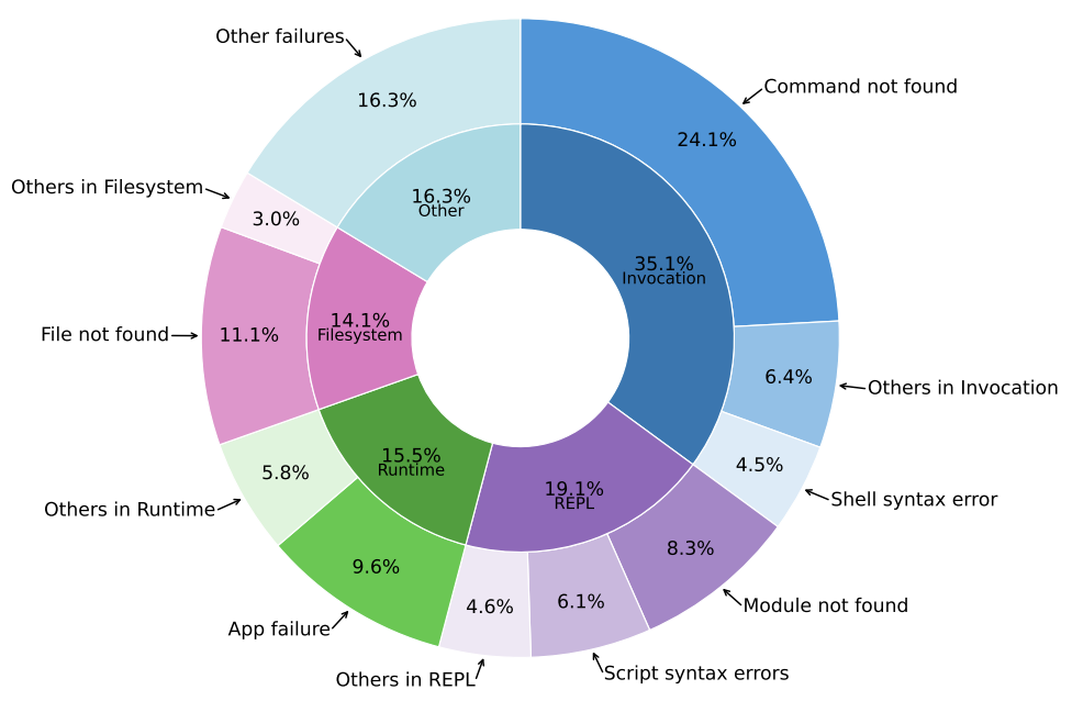 명령어 단위의 가장 흔한 실패 원인: 에이전트가 입력한 명령어의 실패율은 모델에 따라 9.2%~26.7%까지 다양하게 나타납니다. 전체 실패 원인 중 'Command not found'이 24.1%로 1위를 차지했는데, 이는 에이전트들이 설치되지 않은 패키지나 경로에 없는 실행 파일을 무작정 호출하려다 가로막히는 기초적인 환경 인식 오류를 자주 범하고 있음을 보여줍니다.