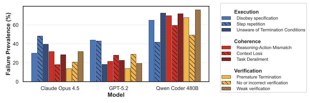 모델별 맞춤형 오류 패턴: 최상위 폐쇄형 모델들은 주로 지시사항을 무시하거나 같은 단계를 무의미하게 반복하는 '실행 오류'가 압도적으로 많이 발생합니다. 반면 오픈소스 모델은 실행, 일관성 유지, 결과 검증 등 모든 영역에서 고르게 실패하는 패턴을 보였습니다.