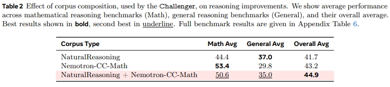 예상대로 NaturalReasoning 데이터셋은 일반 추론 작업에 특화된 문서를 포함하고 있기 때문에 일반 추론 작업에서 가장 큰 성능 향상을 보임