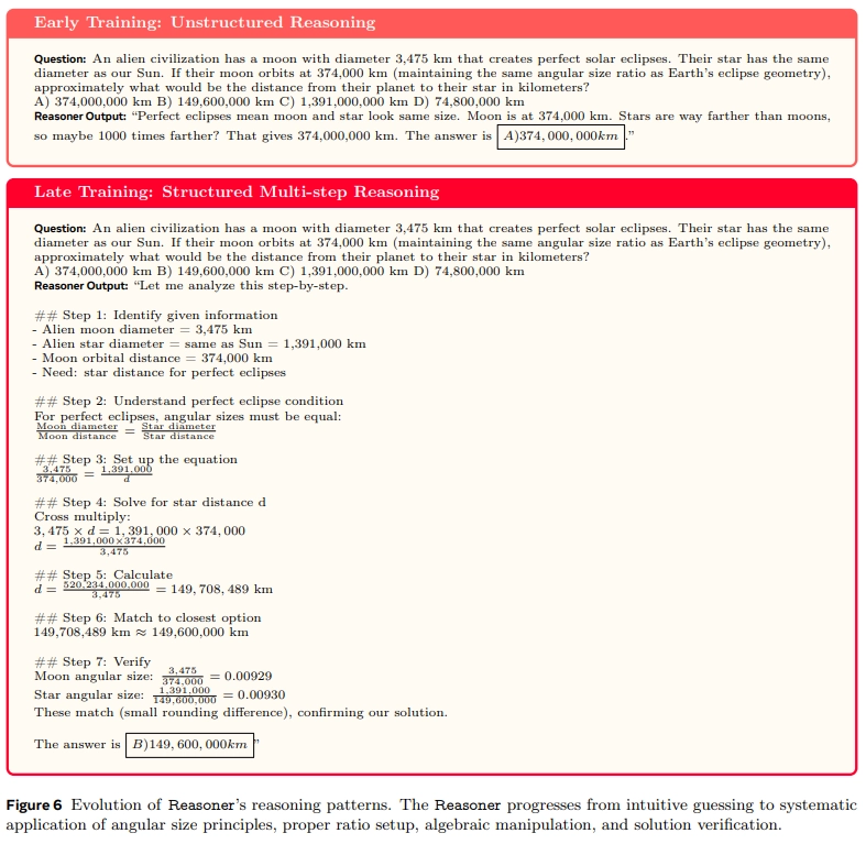 그림 6은 서로 다른 훈련 단계에서 동일한 질문에 대해 추론자가 구조화된 문제 해결 접근 방식을 어떻게 발전시켜 나가는지 보여줌