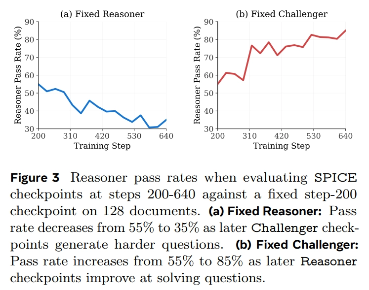 고정된 추론자의 통과율은 점진적으로 더 어려운 문제를 생성하는 방법을 학습함에 따라 55%에서 35%로 감소하는 반면, 고정된 도전자의 통과율은 55%에서 85%로 증가하여 두 역할의 성공적인 공진화를 보여줌